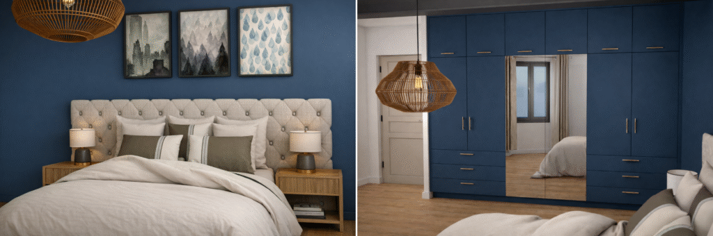 - La touche finale : Le choix de poignées profilées dorées et de textiles texturés transforme une simple chambre en une suite de caractère, ordonnée et luxueuse.